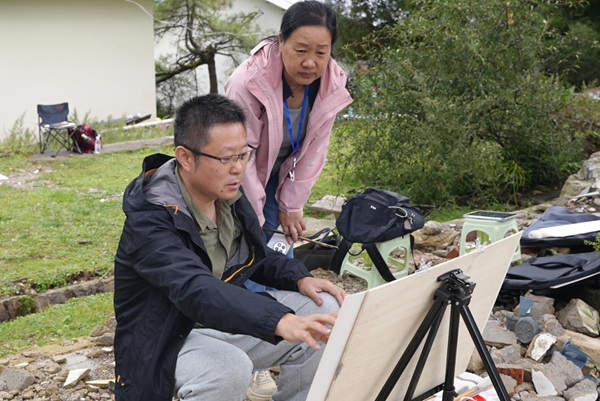宁蒗县学员徐豪龙作为一位连续多次参加活动的学员,此次写生也有了新的体悟和尝试。“聂老师让我明白,画作最重要的是表达内心感受”。一直以油画见长的他,这几天也开始尝试用毛笔作画,提到新的尝试,他说:“虽然技法生疏,但通过淡墨的运用,我找到了新的艺术表达语言。聂老师说‘画自己所想的’,这句话让我受益匪浅。”