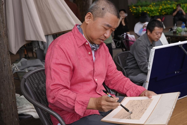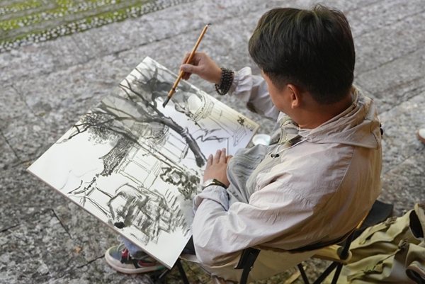 在黑龙潭的写生现场,中国艺术研究院博士、李可染画院终身研究员聂松的创作方式独树一帜。与其他画家不同,他始终使用极浅的淡墨作画,画面如薄雾轻笼,却层次分明,墨色具亲和力。淡墨看似简单,实则需要深厚的功底支撑。聂松解释道:“这需要从书法开始积累手上力道。下笔时墨虽淡,但要力透纸背。”在他的笔下,远山近水、亭台树木,皆以极其精微的墨色变化展现,仿佛将丽江的灵秀之气轻拢慢捻,化作纸上烟云。