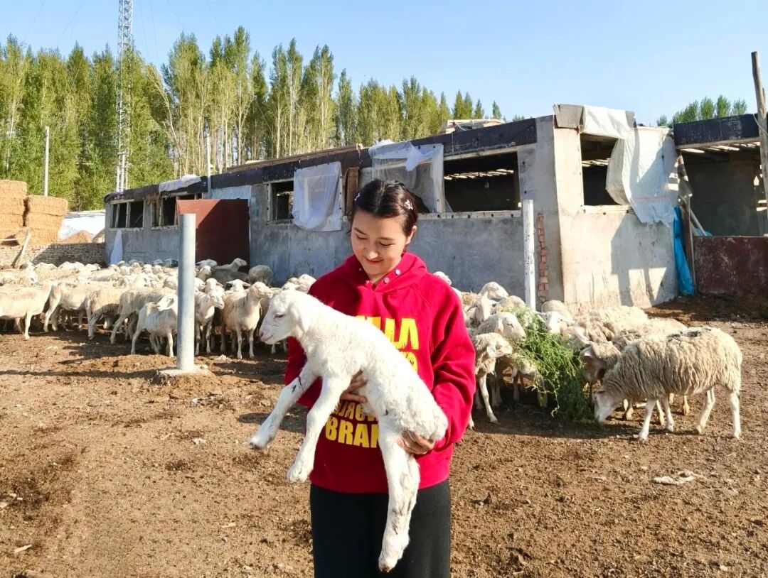 阿合其农场畜牧办工作人员祖白旦•阿布迪米特力普第一时间赶赴羊圈实地查看。羊圈里,刚降生的小羊羔绒毛细软、依偎母羊身旁,她轻轻将其抱起,仔细检查羔羊健康状态。