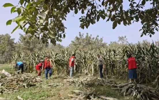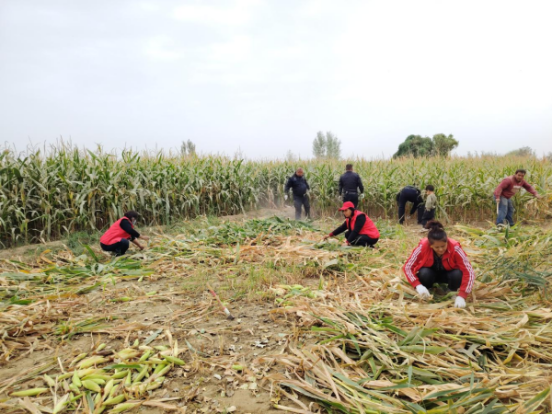 此外,墨玉县阿克萨拉依乡阿热巴格村驻村工作队联合村“两委”,组织党员志愿者组建“助农秋收服务队”,深入田间地头为村民开展玉米收割志愿服务,用实际行动打通为民服务。在玉米地里,志愿者们身着统一的红色志愿服,分工明确、协作高效。有的手持镰刀弯腰割穗,动作娴熟利落;有的则协助村民清理玉米秸秆,为后续农田管理做好准备,田间地头呈现出一派热火朝天的劳动景象。