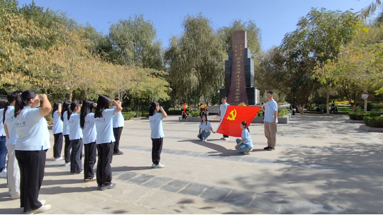 今年的国庆节意义非凡,是支教团在离津4000公里的的天山脚下度过的第一个节日。支教团在于田县参加了升旗仪式,心潮澎湃、热血沸腾。在全场高唱国歌声中,目光注视着冉冉升起的五星红旗,心中更加深了对祖国的热爱与祝福。支教团成员走进库尔班·吐鲁木纪念馆,观看了历史纪录片,在陈列的展台前驻足,聆听他当年的故事。在中国人民解放军独立骑兵师先遣连进藏纪念碑前,支教团成员们缅怀先烈,重温入党誓词,传承红色基因。在集体观看了电影《731》之后,支教团成员们纷纷表示,要铭记历史,勿忘国耻,发奋学习,教书育人,要讲好爱国故事,将促进民族大团结,铸牢中华民族共同体意识贯穿始终,为边疆建设贡献青春力量!
