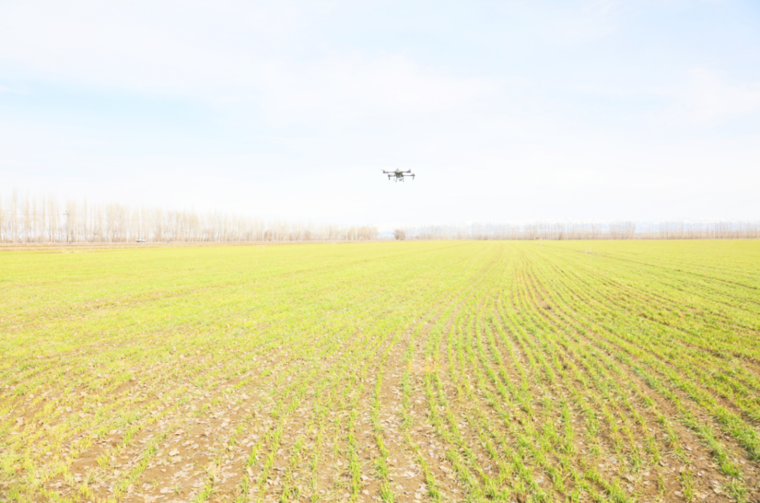 无人机为加尔布拉克农场小麦喷施叶面肥。