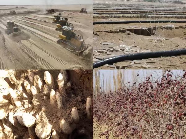 随着150马力拖拉机、360马力推土机等设备普及,传统治沙模式彻底改变。“设备一推沙丘平,滴灌带一铺,苗子能喝上安稳水,成活率一年比一年高!”喀迪尔•哈里克说,如今推沙平地效率提高10倍,苗木成活率稳定在85%以上,“再也不用看着沙子犯愁了”。