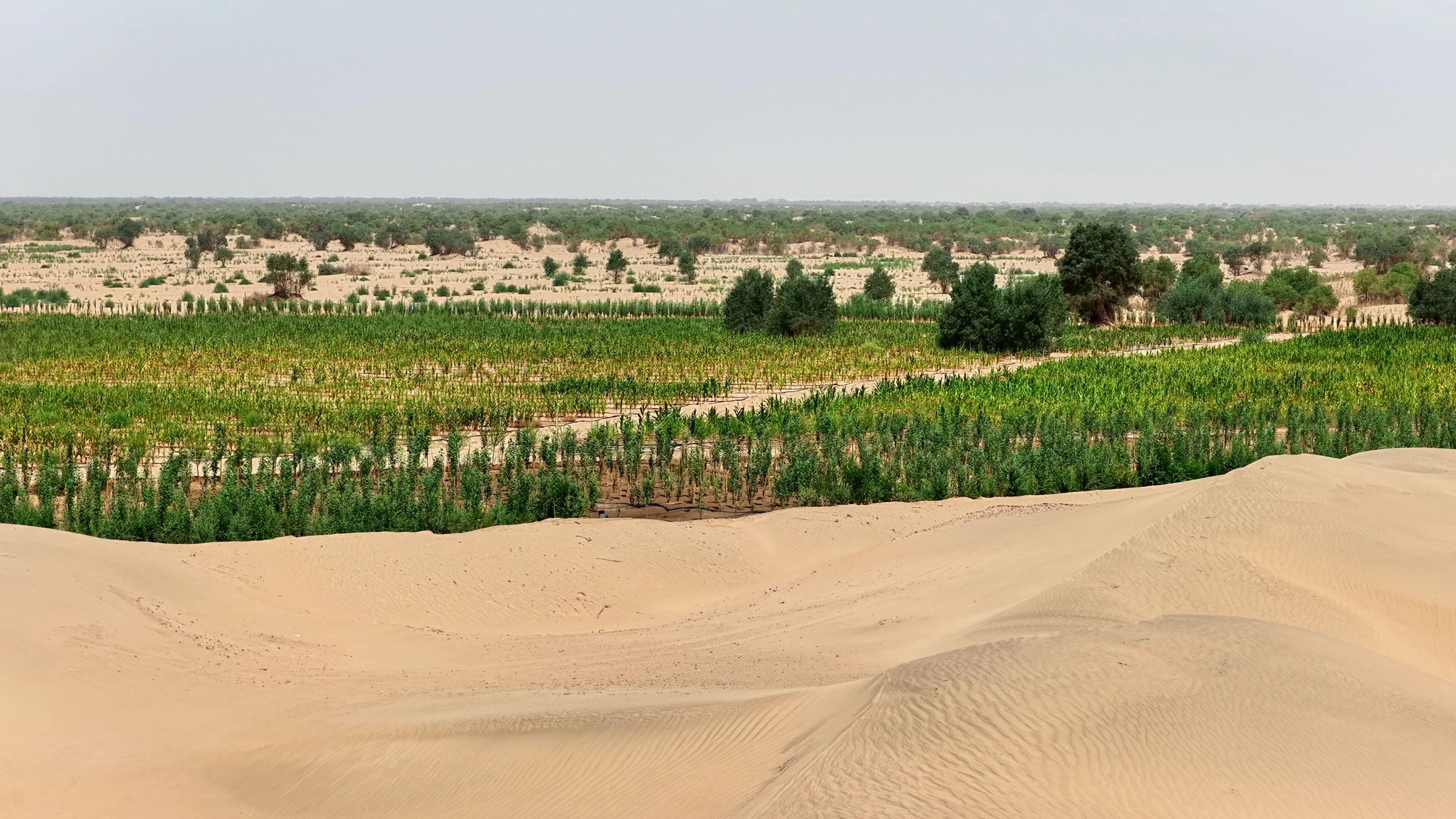 高效治沙场景在墨玉县随处可见。2024年11月起,墨玉县雅瓦乡组织80余辆大型治沙设备开展2.2万亩沙地平整作业,截至今年初已完成2万余亩;喀迪尔带领团队在喀尔赛镇沙漠边缘持续攻坚,一点点把荒沙变成绿地,成片梭梭林连成绿色长城,牢牢守护着身后的村庄。