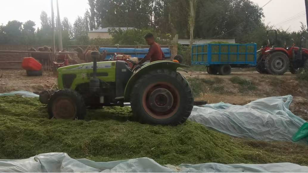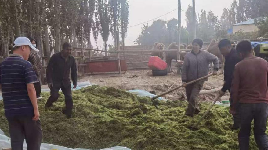 深秋时节,于田县兰干乡托格拉克村的青贮作业现场呈现出一派火热景象:满载新鲜牧草的车辆往来穿梭,粉碎机发出阵阵轰鸣,将青绿秸秆绞碎成细碎的料状;村民们围在青贮窖边,手持工具,认真地将色泽鲜亮的碎料均匀摊铺、反复平整。机械与人力协同配合,共同将眼前的“绿色生机”,稳稳地“锁”成牲畜越冬的“营养宝库”。