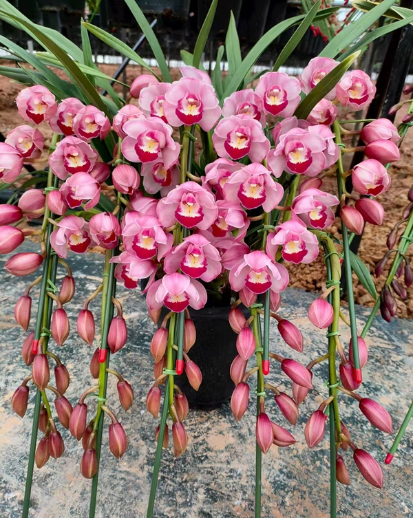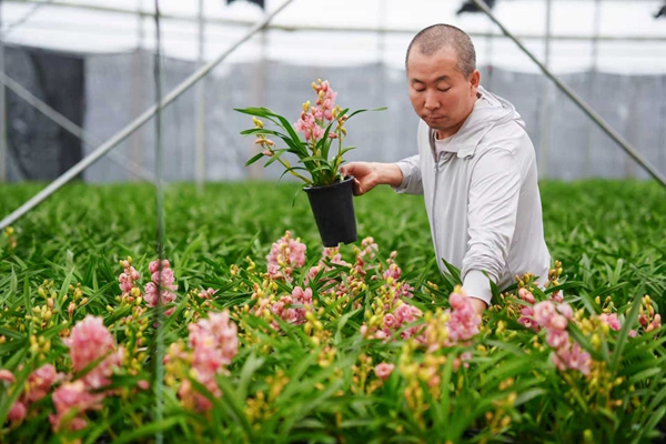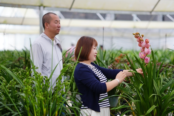 为了应对花卉市场的同质化竞争,多年来,李冠军夫妇勤于思考,敢于尝试,潜心经营。在他们的努力下,2024年瑞兰花卉有限公司实现年产拱兰、杂交兰、桌面兰等新品种兰花7.2万盆,年产值510万元,并辐射带动了周边区域发展大花蕙兰切花生产,目前种植面积已达320亩。同时,还吸纳周边30多名群众就近就业。依托瑞兰花卉的示范作用,红塔区的其他盆花企业也悄然向“模式多元化、产品多样化”方向转型。