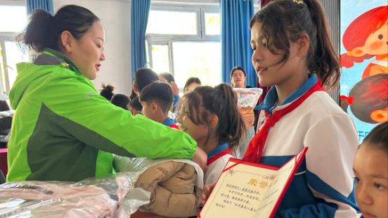 “拿到新书包我太高兴了,以后可以用它装课本,还有这个足球,我要和小伙伴们一起在操场上踢!”受助儿童代表小艾拿着新物资,站在台上激动地分享心声。稚嫩的声音里满是喜悦与感激,她接着说:“谢谢叔叔阿姨们,我一定会好好学习,将来也要像你们一样,帮助更多有需要的人。”