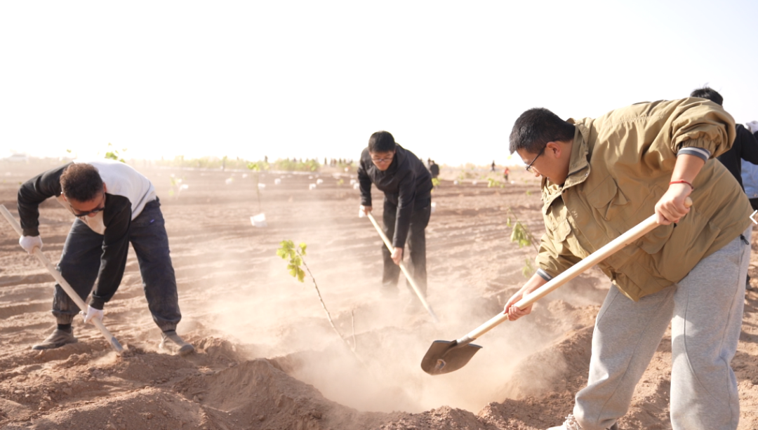 种植现场,大家热情高涨,干劲十足。或两三人一组,或四五人搭档,分工明确,配合默契。挥锹挖坑、扶正树苗、培实新土……每一道工序都做得一丝不苟,现场一派繁忙景象。新栽下的无花果树苗整齐排列,在微风中轻轻摇曳,展现出勃勃生机,为这片土地注入了新的活力。
