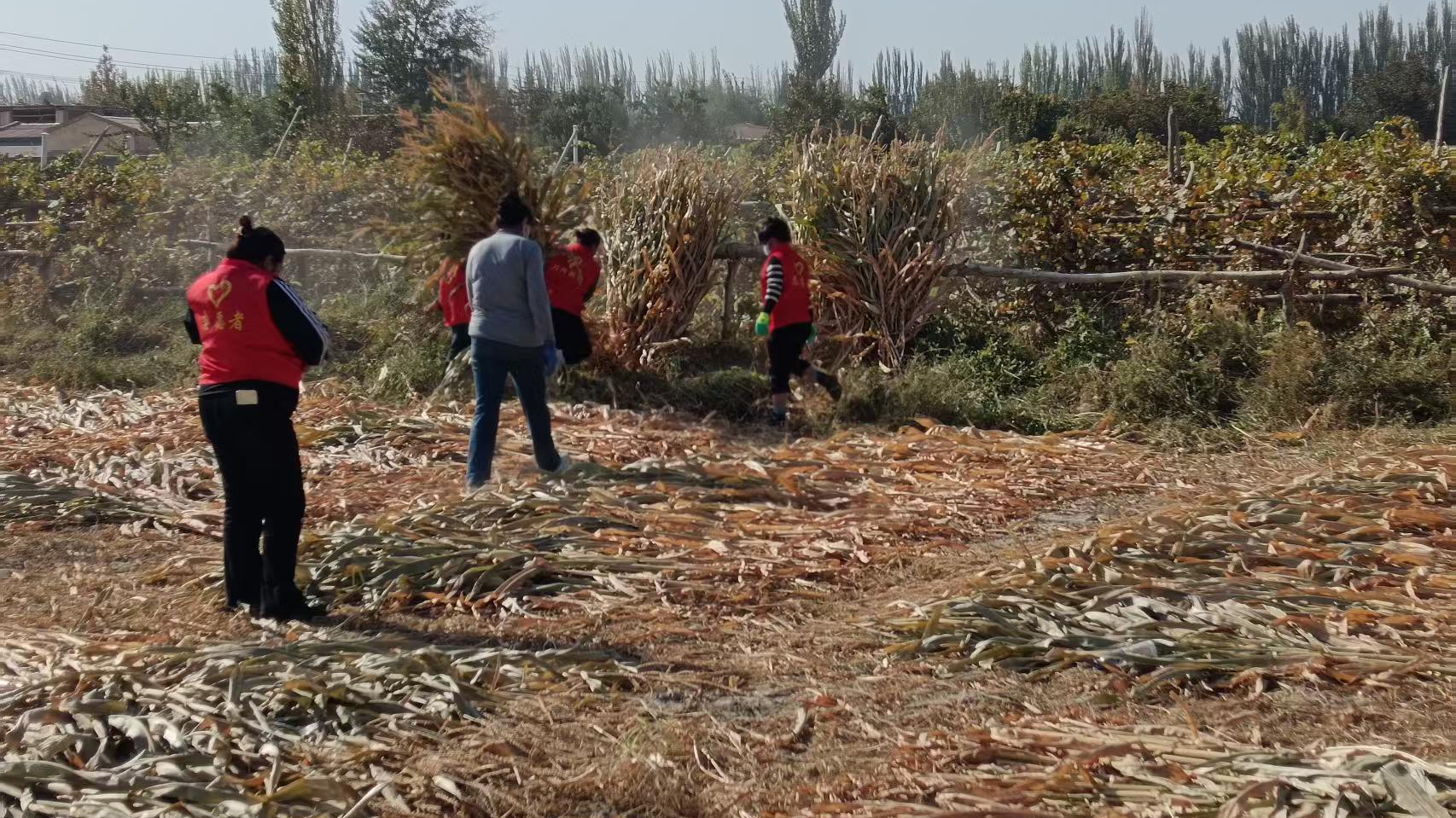 针对村内3户老人家庭,志愿者们迅速分组,积极投身到秋收收尾与冬播准备工作中。巴扎尔村村民赛买提•亚奴司今年61岁,因身体原因住院治疗,无法收割自家剩余的2亩玉米。志愿者团队得知这一情况后,主动承担起收割任务,齐心协力将玉米搬运至晾晒场,有效解决了“秋收收尾慢、冬播担心冻”的难题,让老人无需为农事忧心。