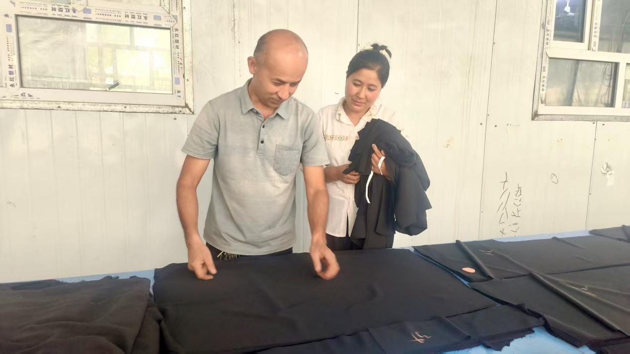 转折发生在2021年,艾则孜・麦合木提看到了扩大经营的契机。“当时村里不少妇女想上班又走不开,我要是能办个制衣厂,既能接大订单,又能帮大家在家门口就业。”他拿着创业计划书,在镇政府的协助下,租下村集体闲置厂房,申请到5万元创业补贴,购置10台新缝纫机,将小裁缝店升级为“新疆碧叶贸易有限责任公司”,专门承接校服、工装等批量订单。
