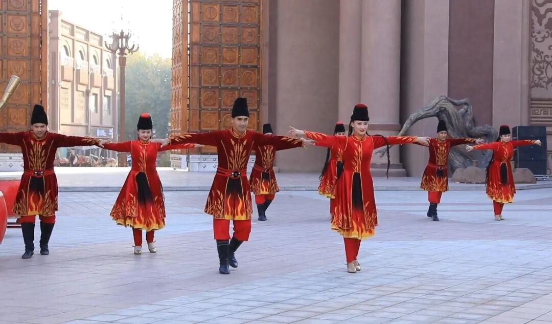 仪式现场,身着色彩艳丽刀郎服饰的演员们率先登场,手鼓敲击出明快的节奏,热瓦普奏响悠扬的旋律,粗狂豪迈的刀郎麦西热甫舞蹈随即展开。演员们时而舒展双臂模拟胡杨摇曳,时而踏步转圈再现田间劳作场景,生动的演绎让现场气氛迅速升温。游客们纷纷举起手机记录精彩瞬间,生怕错过任何一个文化亮点。