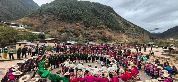 当天的核心亮点当属《尼汝村志》首发。这部迪庆州首部传统村落志,历时近4年编撰,由市史志办深入调研打磨、中国旅游集团资助,不仅梳理了尼汝的自然生态与社会变迁,更留存了祭山跑马节、锅庄舞等民俗记忆,既是村落“活档案”,也是传承乡土情怀的“活教材”。午后的集体宴席上,糌粑、酥油茶香气四溢,随后的锅庄舞展演中,舞者甩袖踏歌,让观众触摸到藏村文化的温度。