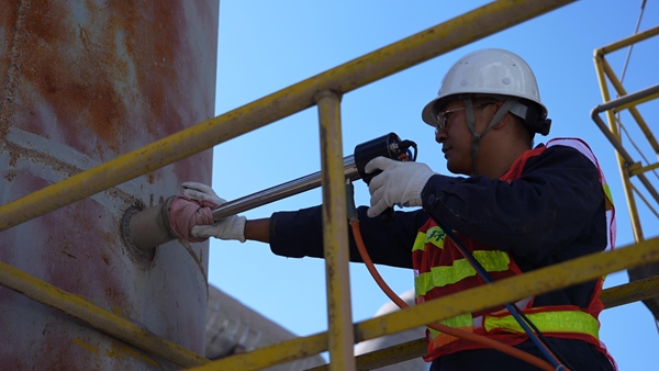 近日,大理州生态环境局弥渡分局生态环境监测站监测员身着反光背心,在华润水泥(弥渡)有限公司废气排放口进行采样监测,为环境监管提供确切依据。