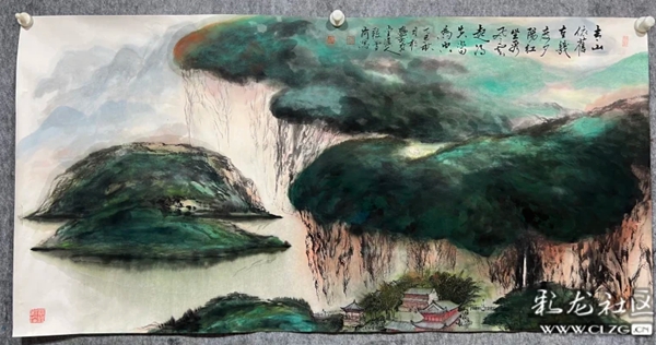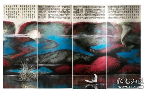国画创作中,他以墨为基,将泼彩与皴擦结合,营造出似真似幻的独特意境,既存传统山水笔墨韵味,又融现代抽象艺术构成理念,创作出独具特色的“梦境山水”系列。作品突破传统藩篱,以多层渲染技法控制水墨浓淡干湿,在宣纸上构建深邃空间。滇派重彩山水代表作《蓝山红岩深涧图》,以色块交融与大胆泼墨形成鲜明对比,既保有中国画空灵意境,又具当代艺术形式美感,与篆书相得益彰,为传统艺术当代转化提供了有益借鉴。