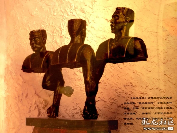 雕塑代表作《众志成城》便是这一理念的生动实践。1998年抗洪救灾的特殊时期,他以极具张力的雕塑语言,将子弟兵团结战斗的顽强意志凝为永恒。技法上,他融合东方美学的写实与写意,既真实刻画人物面对生死的沉着凝重,又大胆省略洪水以下的人体部分,突出手臂紧靠形成的力量之美。这种精准洗练的艺术处理,将“抗洪精神”升华为民族记忆,作品不仅斩获全军美展大奖、入选1999年全国第九届美展,更被中国人民革命军事博物馆永久收藏,成为记录时代精神的艺术丰碑。