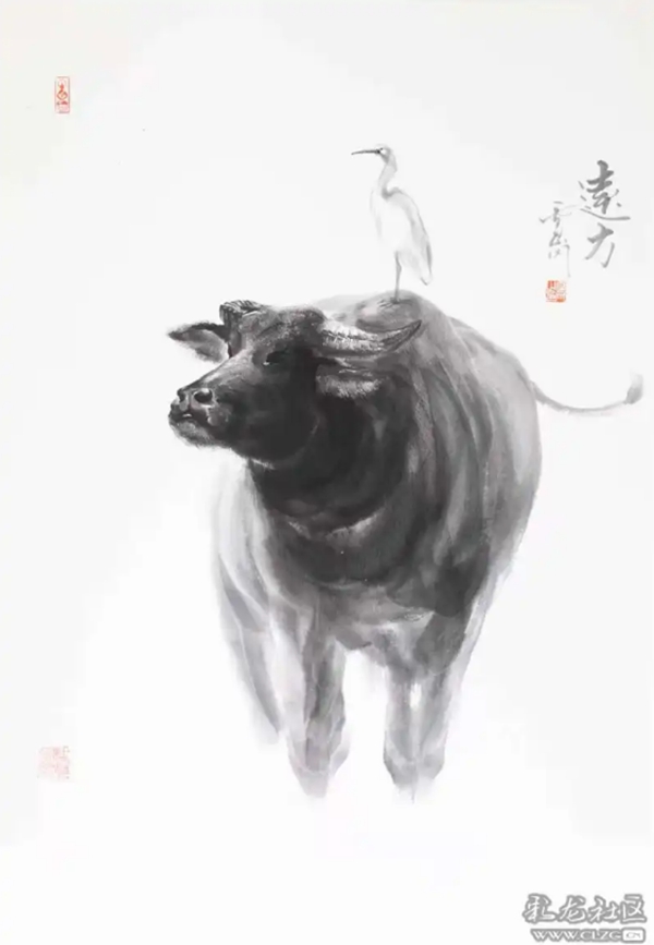 水墨《牛》系列则展现了另一种美学追求。他深挖牛与人类相伴的千年渊源,提炼其勤劳、本分、重情的精神特质,以当代水墨写实技法精心呈现。作品唤醒古滇国青铜器上瘤牛纹样的历史记忆,让承载南方丝绸之路密码的灵物走出博物馆,成为参与当代文化建构的活态基因。这些创作与“孺子牛、拓荒牛、老黄牛”的时代精神相映成趣,传递着尊重自然、开拓进取的美好愿景。
