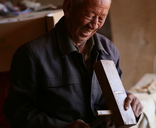 拔廊房手艺人张世泰正在做木制摆件。姜巍摄