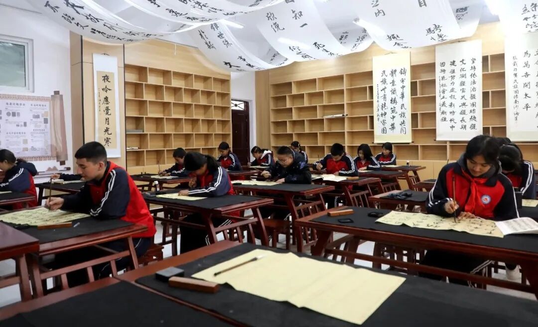 近年来,在上海援疆莎车分指的大力支持下,莎车县第七中学实现了办学条件与教学质量的同步提升。学校在完善标准化普通话实训基地的基础上,相继建成书法室、戏曲室、扎染工坊等特色教学空间。其中,书法教学充分借鉴上海先进经验,将传统书法艺术与文化传承深度融合。2024年,该校师生书法作品在莎车县教育局展厅展出,成为沪喀两地文化交流的鲜活缩影。