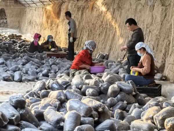 白杨河乡双泉村社员与村干部一起分装菌包。潘安摄