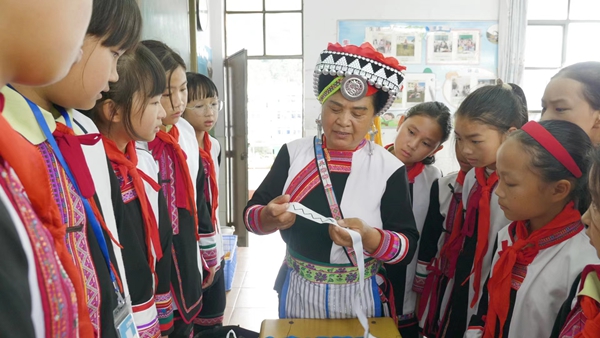 以“传”授艺,赓续文化血脉。鼓励具备非遗技艺的老干部担任“传承导师”,通过师徒结对、校园传习、社区教学等方式,推动非遗传承。例如,西三镇退休教师志愿服务队深入当地小学,教授阿细语言、歌舞、刺绣等,将非遗融入“大课间”与主题班会;原市文化馆馆长陈保舜持续指导乡镇申报传统文化保护区,助力红万村、高甸村等传承基地建设。