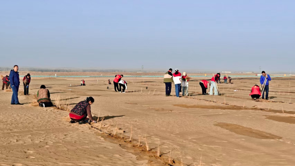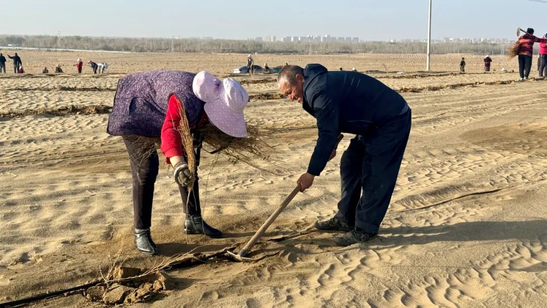 近日,塔克拉玛干沙漠南缘的于田县寒意袭人,室外气温已逼近零度,但沙漠锁边带的种植现场,却是一派热火朝天的忙碌景象。