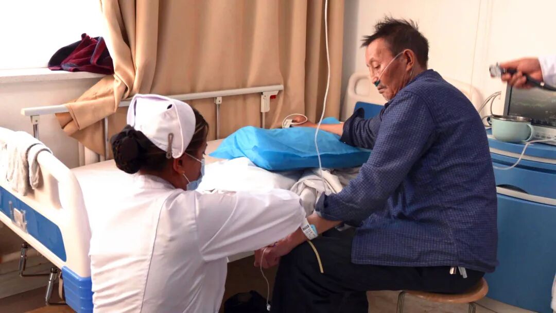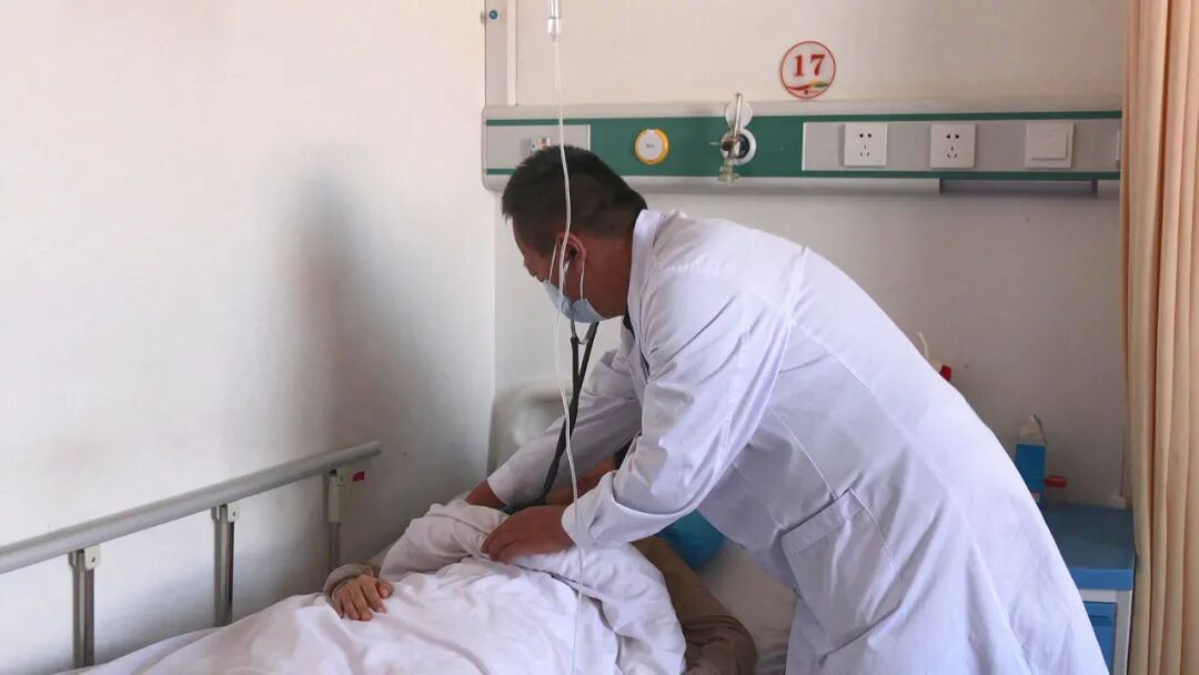 近日,在精河县人民医院呼吸科住院部,医护人员正有序进行查房。医生在每张病床前细致询问患者情况,查阅病历并及时调整治疗计划。