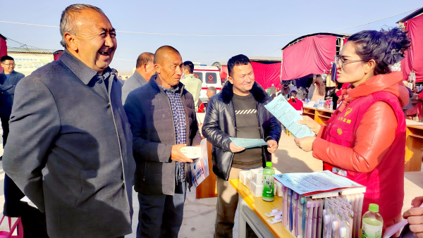 活动伊始,于田县文化馆、文工团带来的麦西来甫表演以欢快旋律与灵动舞姿吸引赶集群众,现场掌声喝彩不断、氛围热烈。各服务区域前人头攒动,文化区通过歌舞、非遗展示为群众送上视听盛宴。科技区结合本地实际,发放科普手册、讲解种养技术与家电使用技巧,精准解答生产生活难题;教育区聚焦家长关切,解读入学及升学政策。免费发放读物并提供教育规划指导;卫生区医护人员为群众测血压、问诊查体,普及健康知识,守护群众身心健康。