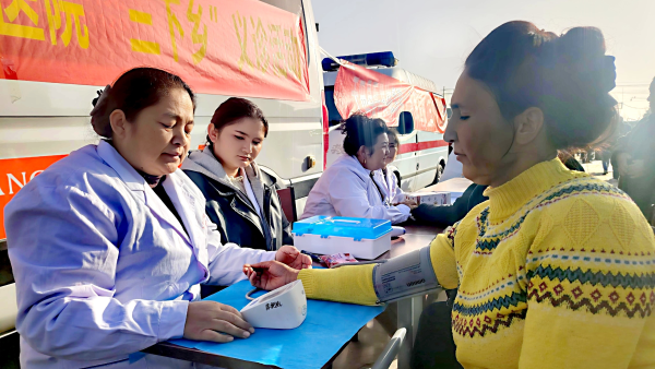 医护人员为群众测量血压,送健康服务。奴日曼古丽摄
