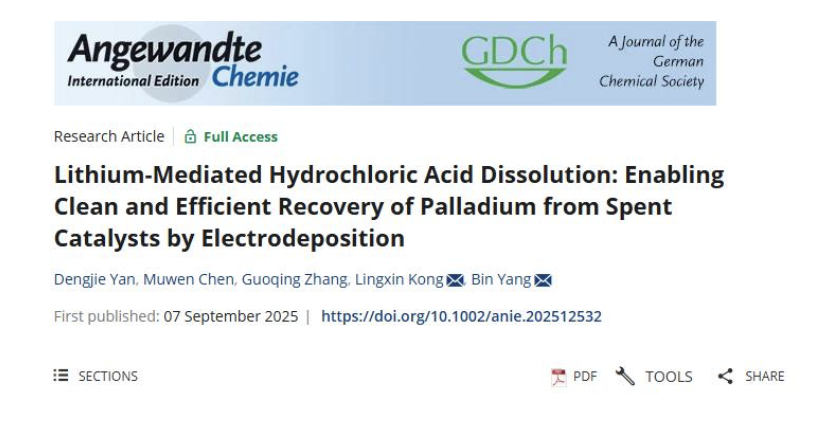 相关成果以“Lithium-Mediated Hydrochloric Acid Dissolution: Enabling Clean and Efficient Recovery of Palladium from Spent Catalysts by Electrodeposition”为题发表在化学领域顶级期刊《Angewandte Chemie International Edition》上。