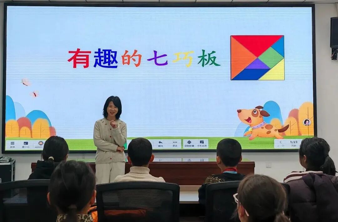 在课堂上,毛丽红作为拥有丰富低年级教学经验的高级教师,以其生动的教学方法,引导学生认识七巧板的组成结构,掌握基本拼搭技巧。课程通过图形分解与组合的实践操作,让学生在动手拼搭中理解几何关系,感受数学之美。