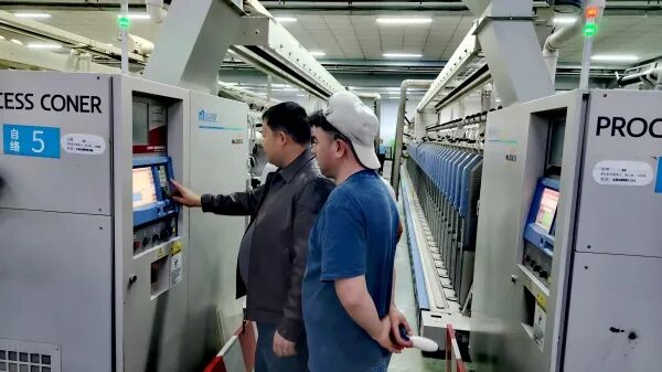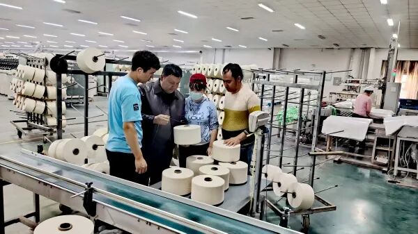 吾卜力艾山•麦麦提明在车间和同事检查纱线质量。