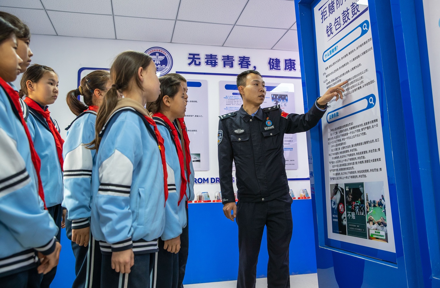 图为民警在“三阵地一中心”内正在向学生们开展禁赌宣传。