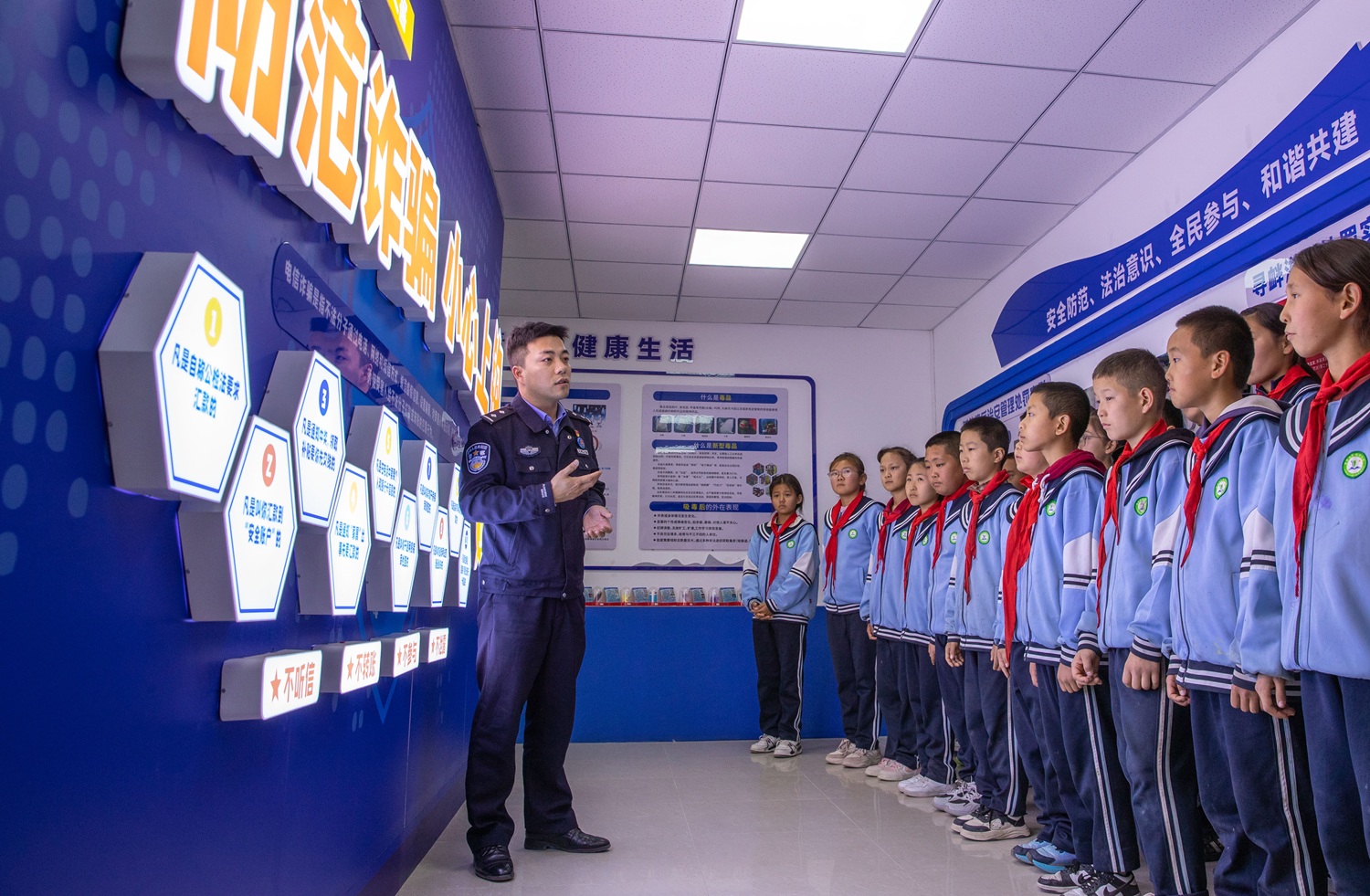 “同学们,这些看似鲜艳的‘糖果’其实是新型毒品,遇到陌生人给的东西千万不能要!”近日,新疆伊犁边境管理支队爱新舍里边境派出所组织辖区小学学生走进“三阵地一中心”,民警通过实物展示、案例讲解,为孩子们上了一堂生动的禁毒与反诈普法课。这一活动,正是该派出所构建“三阵地一中心”普法安防宣教新格局的生动实践。