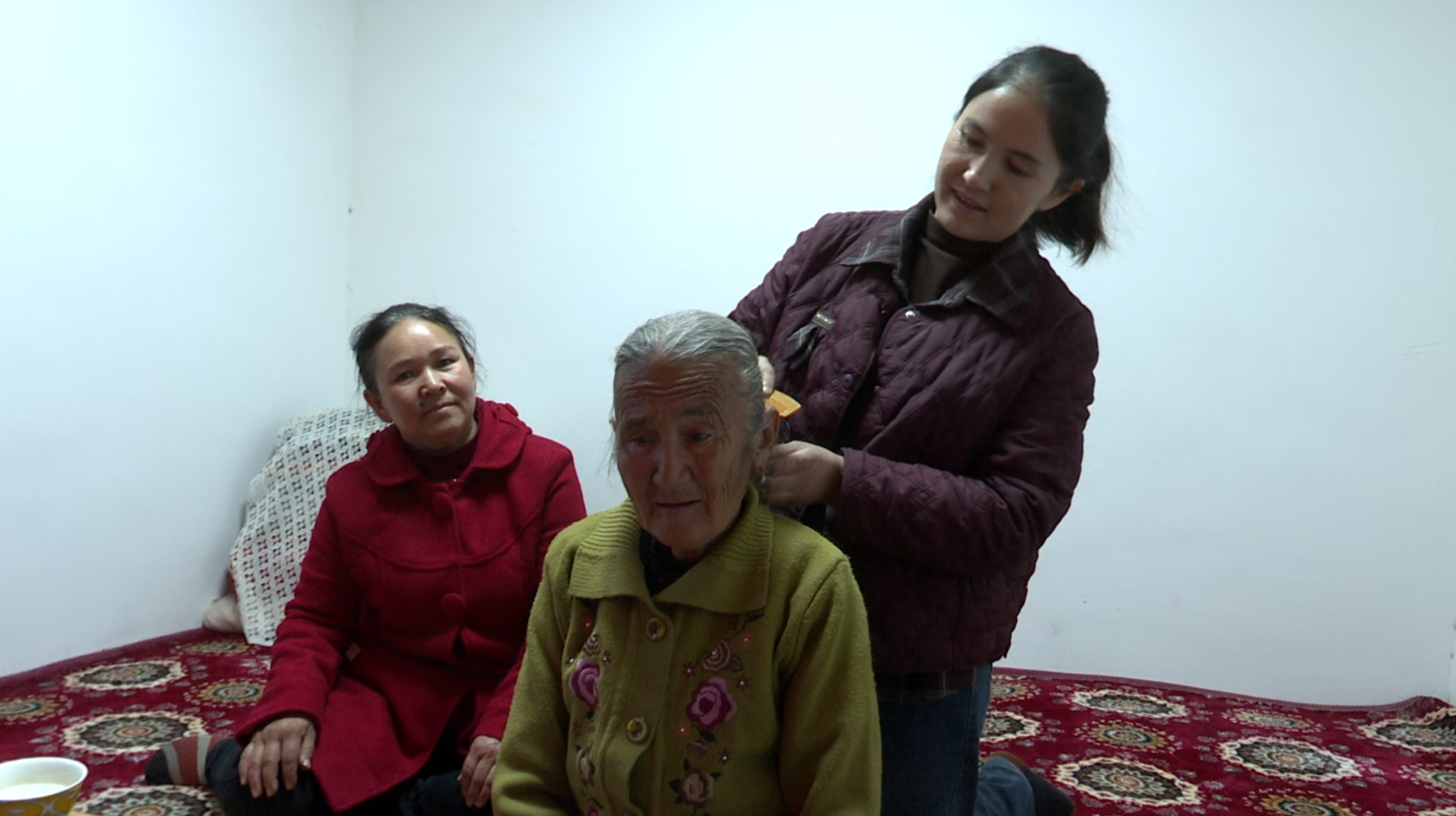 再娜普汗•买买提明正在细心地帮老奶奶梳头发。阿依奴尔摄