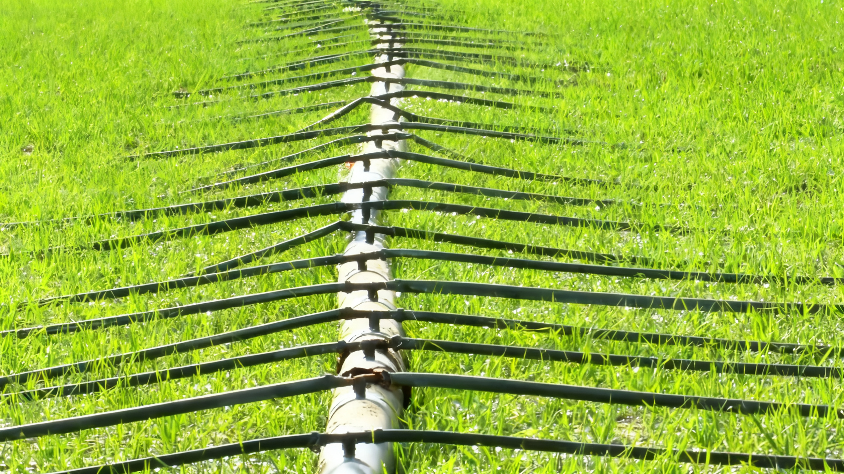 麦田里的滴灌设施有序运转,水珠精准滴灌麦苗根系。伊帕尔古丽摄