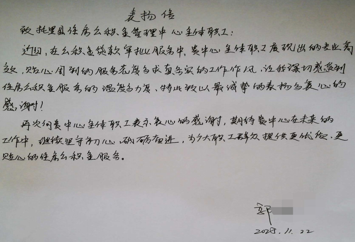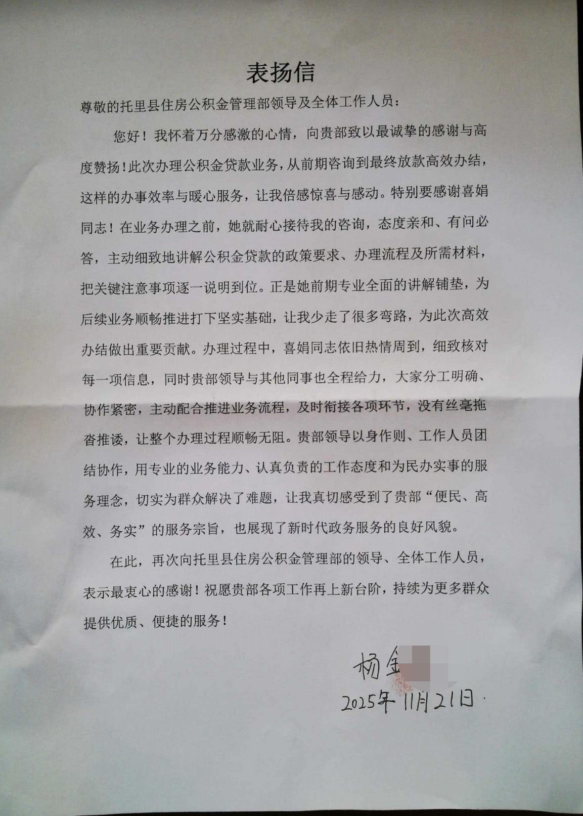 居民郭女士为了方便孩子上学,在学校附近购买了一套新房,便想申请住房公积金贷款缓解经济压力。在业务办理期间,工作人员全程为其耐心细致地讲解政策,高效顺畅地办理手续,每一个环节都衔接紧密,没有丝毫拖沓,让她倍感温暖,特写了一封表扬信感谢托里县管理部的工作人员。