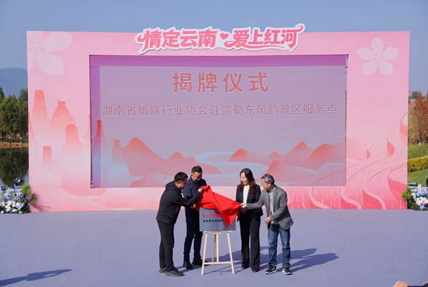推介会上,红河州文化和旅游局与湖南省婚嫁行业协会签署了“手拉手,结对子”对口发展婚庆旅游合作协议,并举行了湖南省婚嫁行业协会驻弥勒东风韵景区服务点揭牌仪式,标志着两地婚庆旅游合作正式开启。与会嘉宾还参与了红河州特色婚服展示与沉浸式互动体验,感受红河州婚俗文化的独特魅力。(周佳艺)