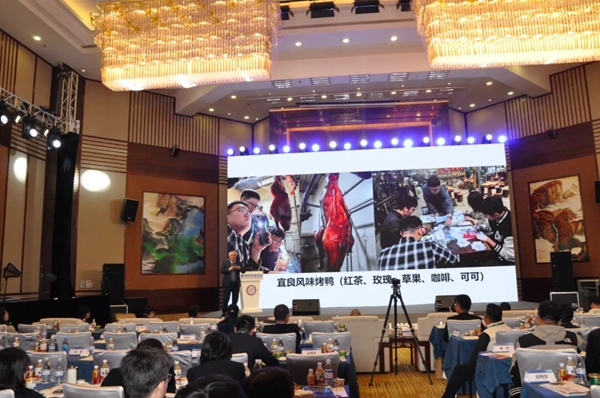 (云南农业大学盛军教授在药食同源专场论坛上交流宜良烤鸭创新成果)
