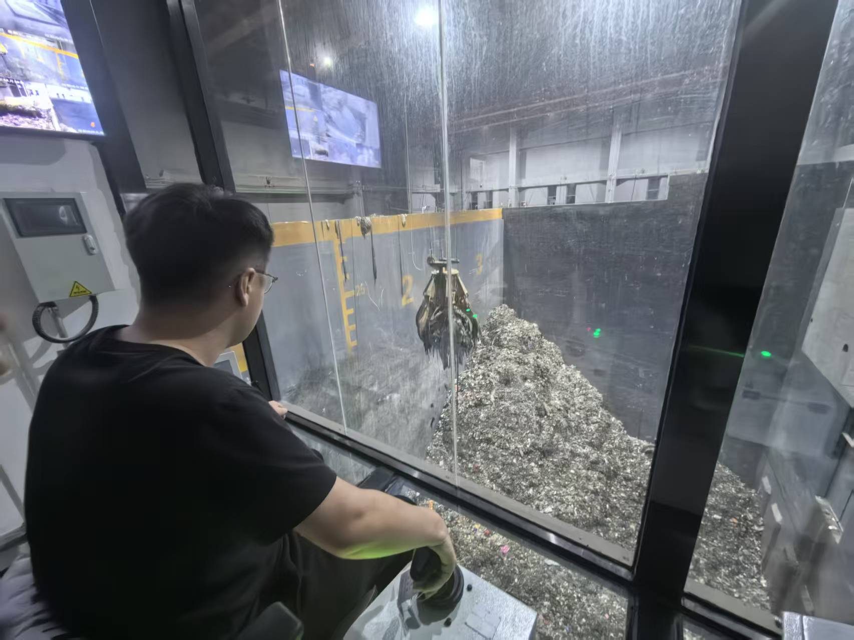 与屏幕上跳跃的数据同步进行的,是垃圾发酵仓内的实体作业。经过强化的钢化玻璃完全隔绝异味,垃圾吊操作员那木如正操作巨大的金属抓斗缓缓降下,张开“铁爪”,将废弃物精准投入焚烧炉的进料口。“这些生活垃圾无需提前分类。”那木如介绍道,“垃圾在仓内需要经过7到10天的发酵,沥出水分,以提高焚烧热值。”