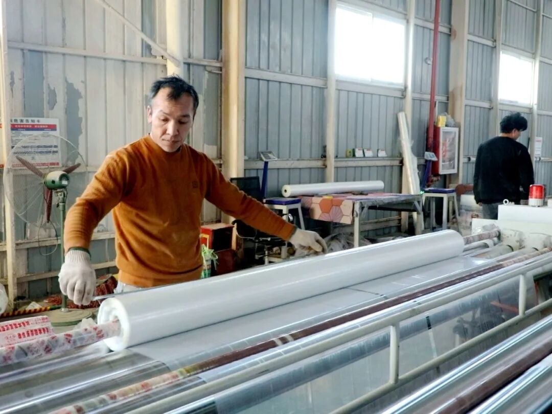 近日,在莎车县阿尔斯兰巴格乡工业园区的地膜厂生产车间内,机器轰鸣、运转不停。工人们各司其职,有的调控仪表温度,有的检测农膜厚度与平整度,还有的负责成品称重、打包和搬运,现场一派繁忙景象。