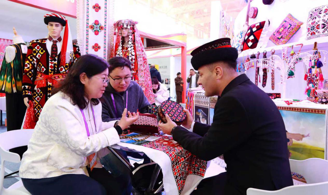 非遗展区内,工作人员向观众介绍塔吉克刺绣产品。王振贵摄