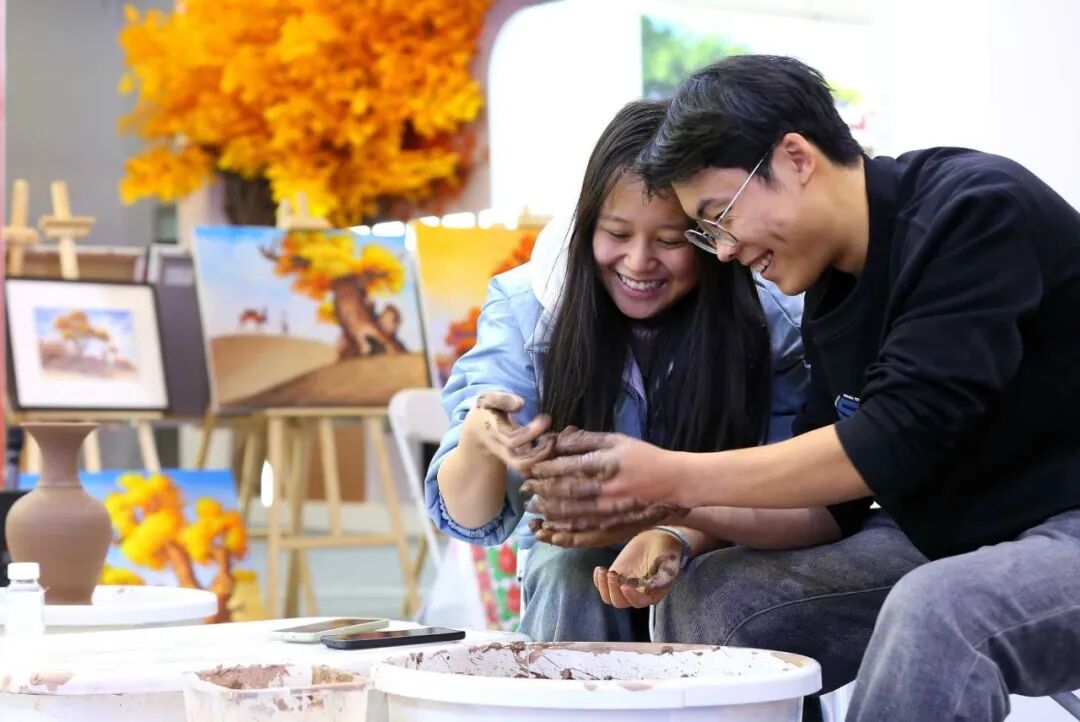 在互动体验区的土陶区,一对年轻情侣双手沾满陶泥,正在转轮上小心翼翼地塑形,学得格外认真。“触摸陶泥的瞬间,仿佛能感受到千年文脉的流动。”女孩的话语道出了年轻一代对非物质文化遗产的热爱,这一幕也成为文化传承后继有人的生动写照。