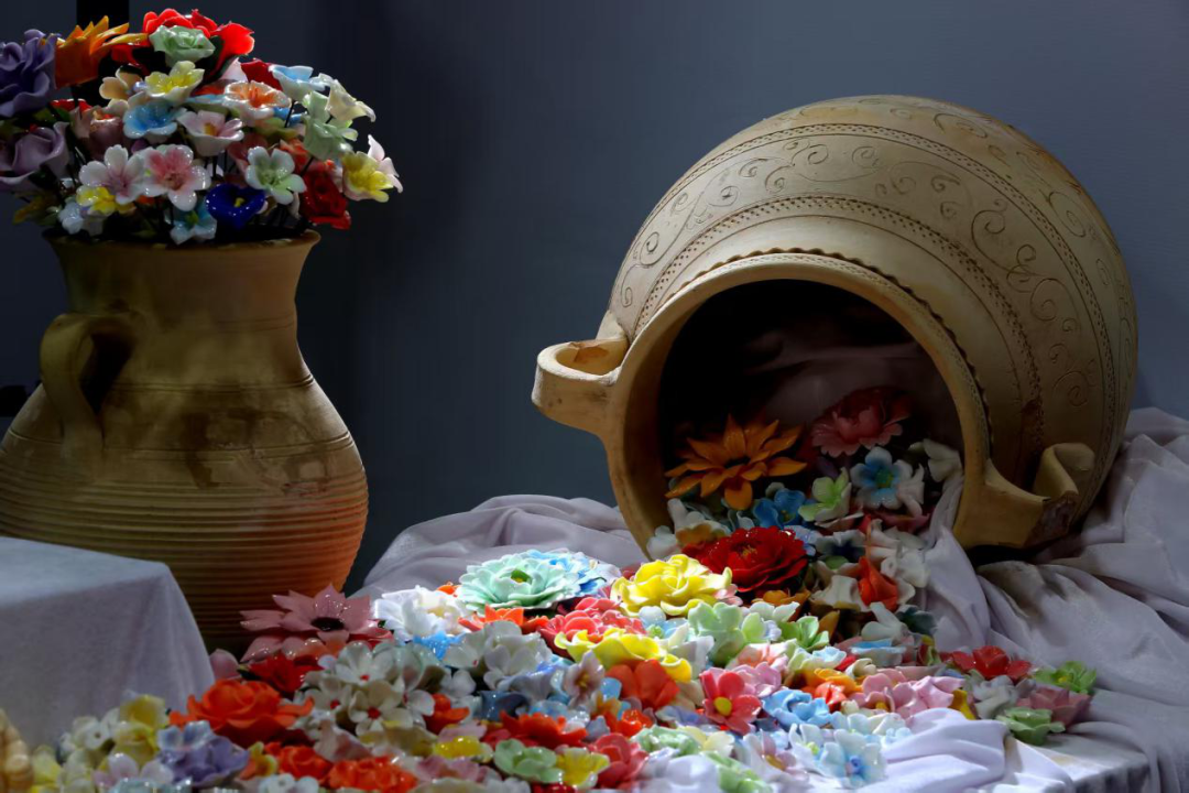 瓷花展区内,“新疆新瓷”的魅力令人沉醉。匠人以本地瓷土为原料,采用高温釉下工艺,将天山雪峰、戈壁胡杨等地域元素融入创作,色彩浓郁热烈又通透灵动。一朵朵瓷花形态逼真,花瓣的纹理与釉色的光泽相得益彰,既有传统陶瓷的厚重底蕴,又兼具现代艺术的创新表达,成为文化交融的见证。