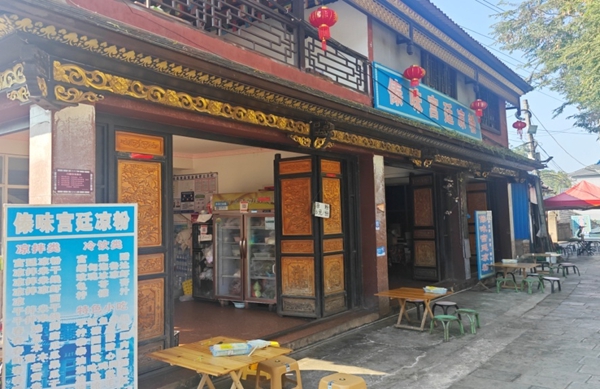 随着宣抚司署的“引流”,周边商户也开始陆续拓展经营种类,从傣族服饰、挎包、手工竹艺品到各种美食应有尽有。2019年,在孟连县烟草专卖局的帮助下,波共恩完成了云香印象零售终端门店的改造升级,有了宽敞明亮、整齐规范的经营环境后,又结合自身厨师的从业经历,波共恩开始在门店经营“宫廷凉粉”,据他介绍,“宫廷凉粉”做法源自土司时代傣王的宫廷厨房,主要以芭蕉芋粉、米凉粉、豌豆粉和孟连特有的花生凉粉为原料,再放入热水焯过的韭菜、豆芽和炒香的花生米、芝麻、蒜泥,并配以小米辣、油辣椒、芫荽、味精、盐等调料,最后倒入自酿的米醋做汤即可食用。