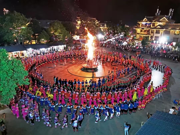 (楚雄州各族群众在彝人古镇景区欢歌载舞、其乐融融)