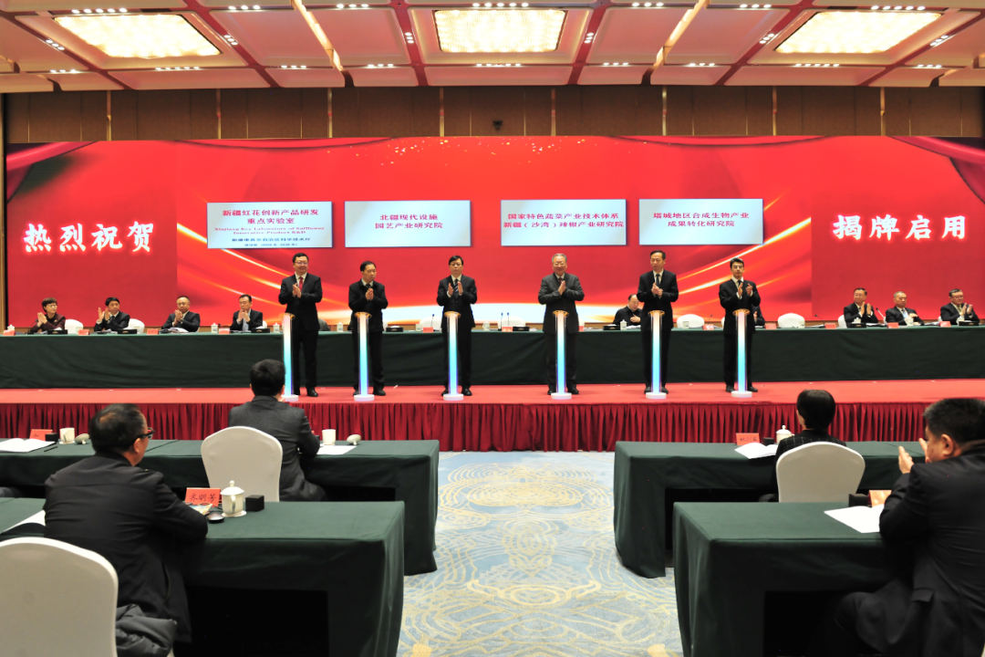 随后,支现伟、阿依丁•托留汗和有关院士专家共同为新疆红花创新产品研发重点实验室、北疆现代设施园艺产业研究院、国家特色蔬菜产业技术体系新疆(沙湾)辣椒产业研究院等12家研究机构揭牌。