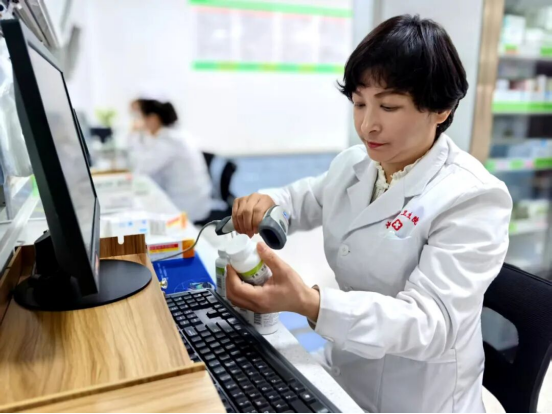 3月26日,玛纳斯县总医院中心药房凉州户镇分院药房,药师韩霞手持扫码枪为药品扫码。资料图片
