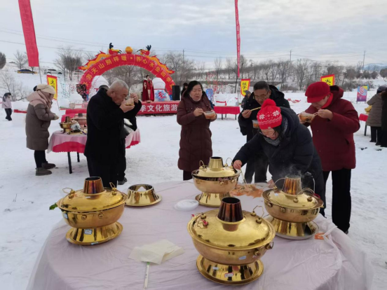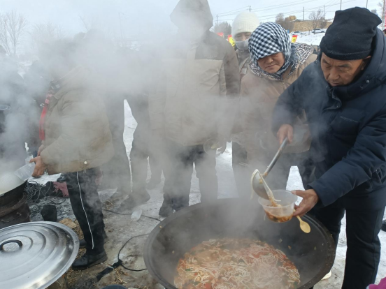 一口口大锅架设在雪地之上,咕嘟翻滚的汤汁中,本地牛羊肉、自家种植的蔬菜、手工粉条等食材鲜香交融,热气氤氲中,村民、游客、返乡游子围炉共食,畅谈家乡变迁。