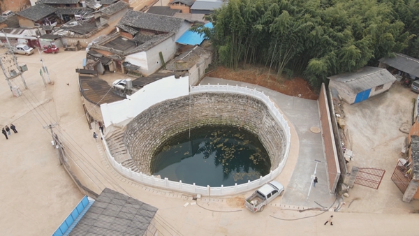 走进大石板村可以看到,升级改造后的古井焕发新颜:洁白的石头护栏环绕井台四周,石碑上“世界大井”四个大字苍劲有力,俯身望去,漏斗状的井体由上万块错落有致的石头砌成,内部66级石踩、32圈井圈独具特色,颇为壮观。据介绍,这口古井占地486.22平方米,深约13米,蓄水容积约3100立方米,被当地村民亲切称作“朱老妈妈井”,2017年被列为区级历史建筑保护单位并命名为“世界大井”。