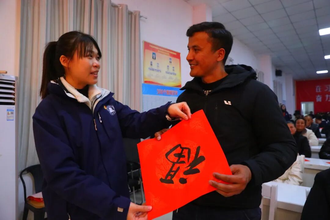 在书法展示环节,天津外国语大学的学生将饱含深情的书法作品赠予阿热勒乡,表达了对于田县发展的美好祝愿。阿热勒乡党委书记现场回赠书法作品,字里行间饱含着对支教团的真挚感谢和对两地情谊的珍视。随后,师生们还将亲手书写的‘福’字一一送到现场群众手中,大家脸上洋溢着幸福的笑容,纷纷表示要好好珍藏这份来自天津的祝福。
